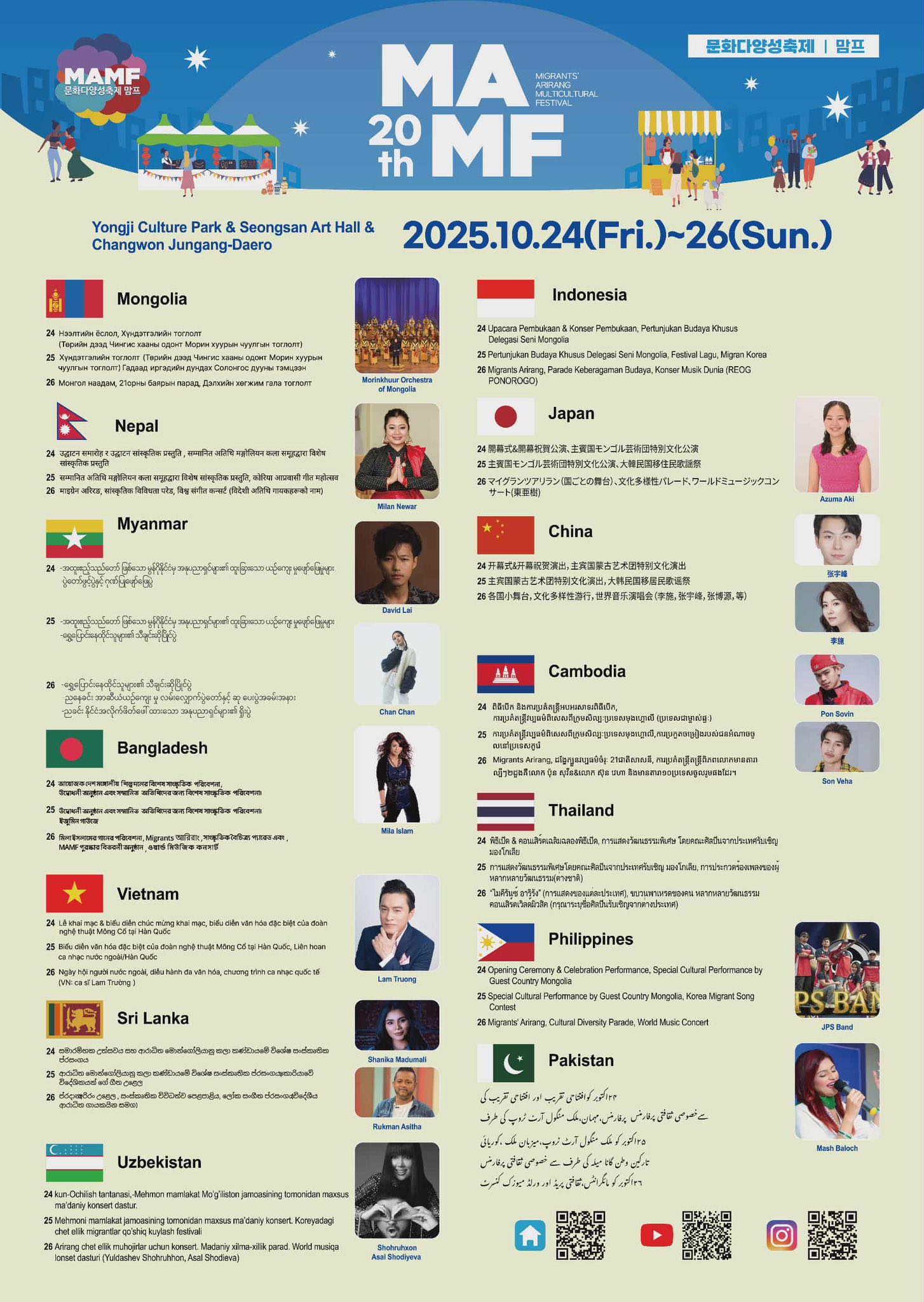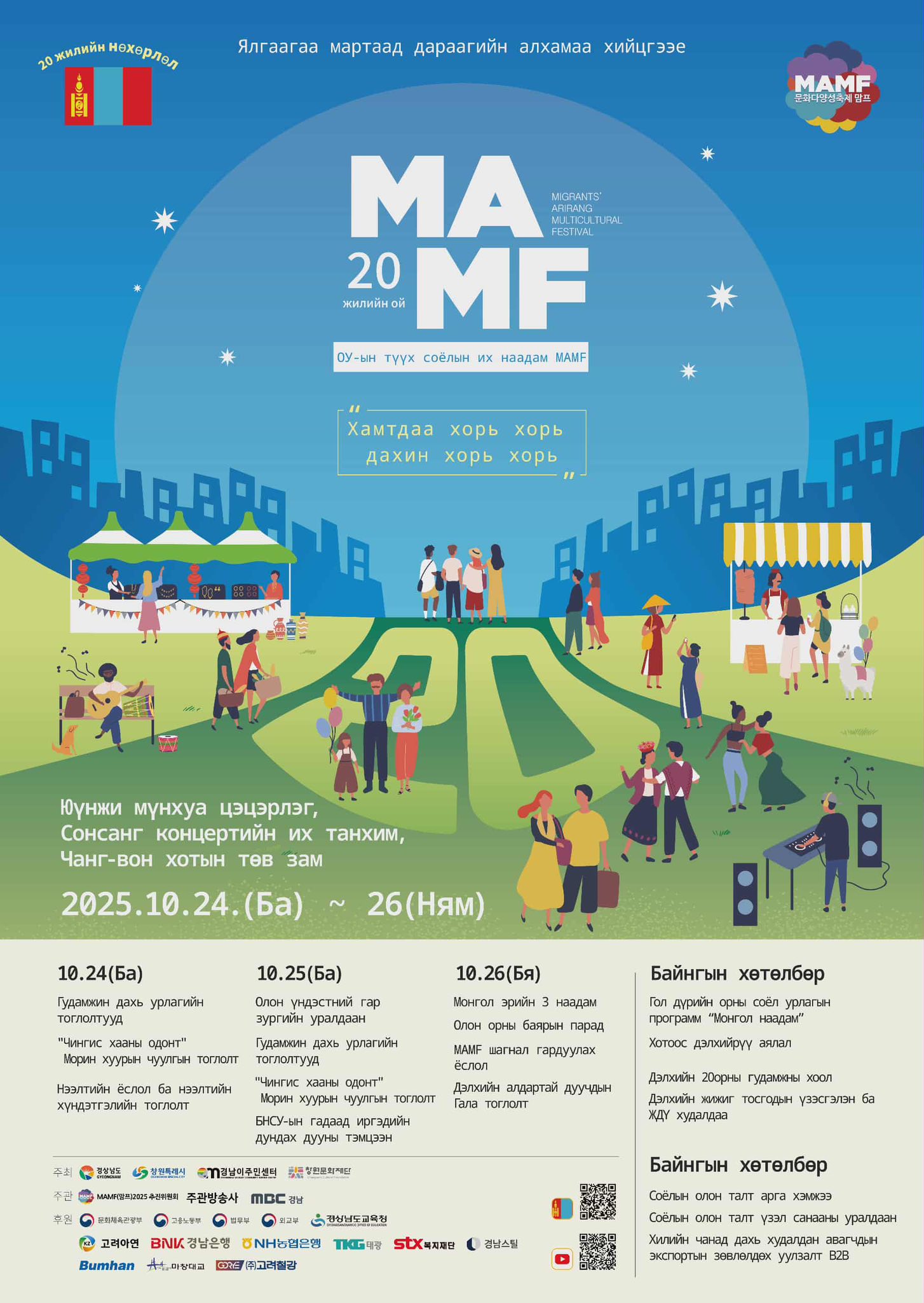 ”MAMF-2025” Олон соёлт гадаад иргэдийн Ариранг Фестиваль тун удахгүй буюу 2025.10.24-26 хооронд Чавонг хотноо болно. Монгол улсын иргэд та бүхнийг өргөнөөр оролцохыг урьж байна.