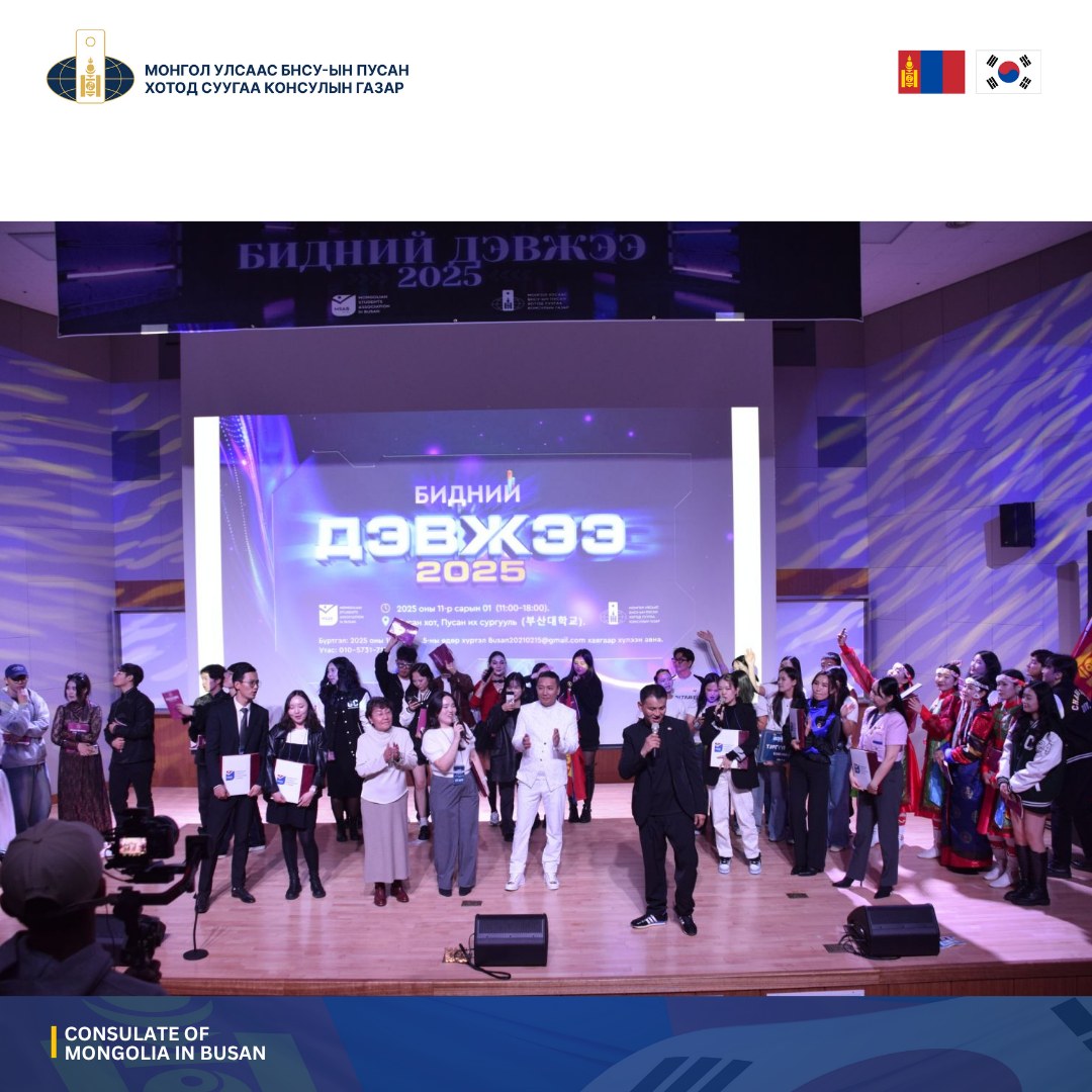 Монгол Улсаас БНСУ-ын Пусан хотод суугаа Консулын газар 2025 оны 11 дүгээр сарын 1-ний өдөр Пусан хотын Оюутны холбооноос зохион байгуулсан “БИДНИЙ ДЭВЖЭЭ 2025” авхаалж, сэргэлэнчүүдийн анхдугаар тэмцээнийг дэмжиж, идэвхтэй оролцлоо.