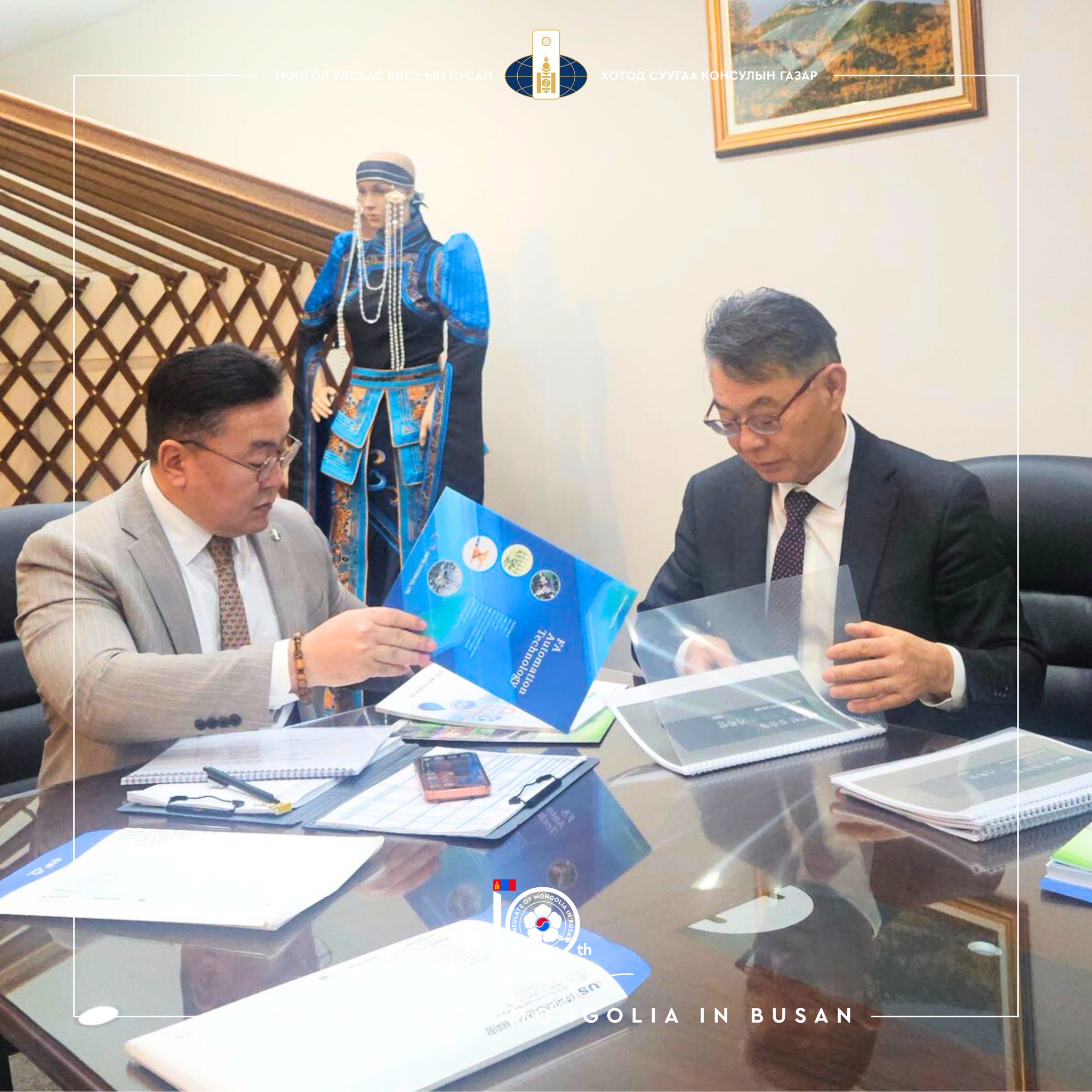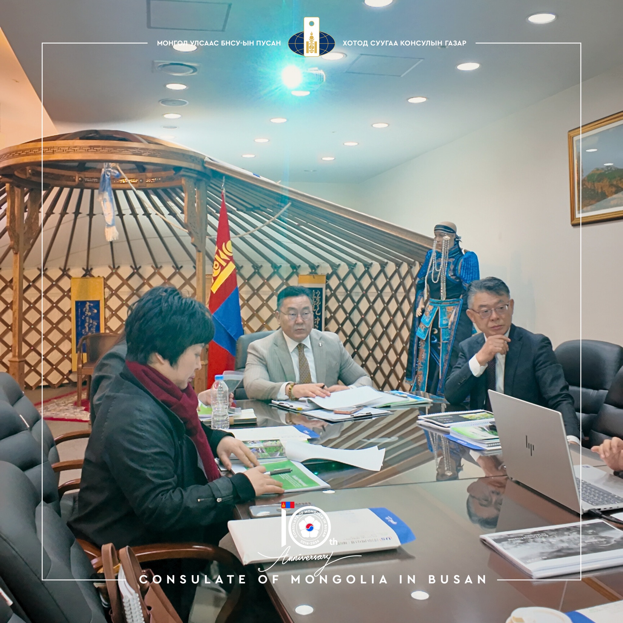 Монгол Улсаас БНСУ-ын Пусан хотод суугаа Консул Ц.Жадамбаа Газар тариалан, хөгжлийн зөвлөх Чуэ Бён Ху тэргүүтэй Ухаалаг фармын мэргэжилтнүүдийг хүлээн авч уулзлаа.