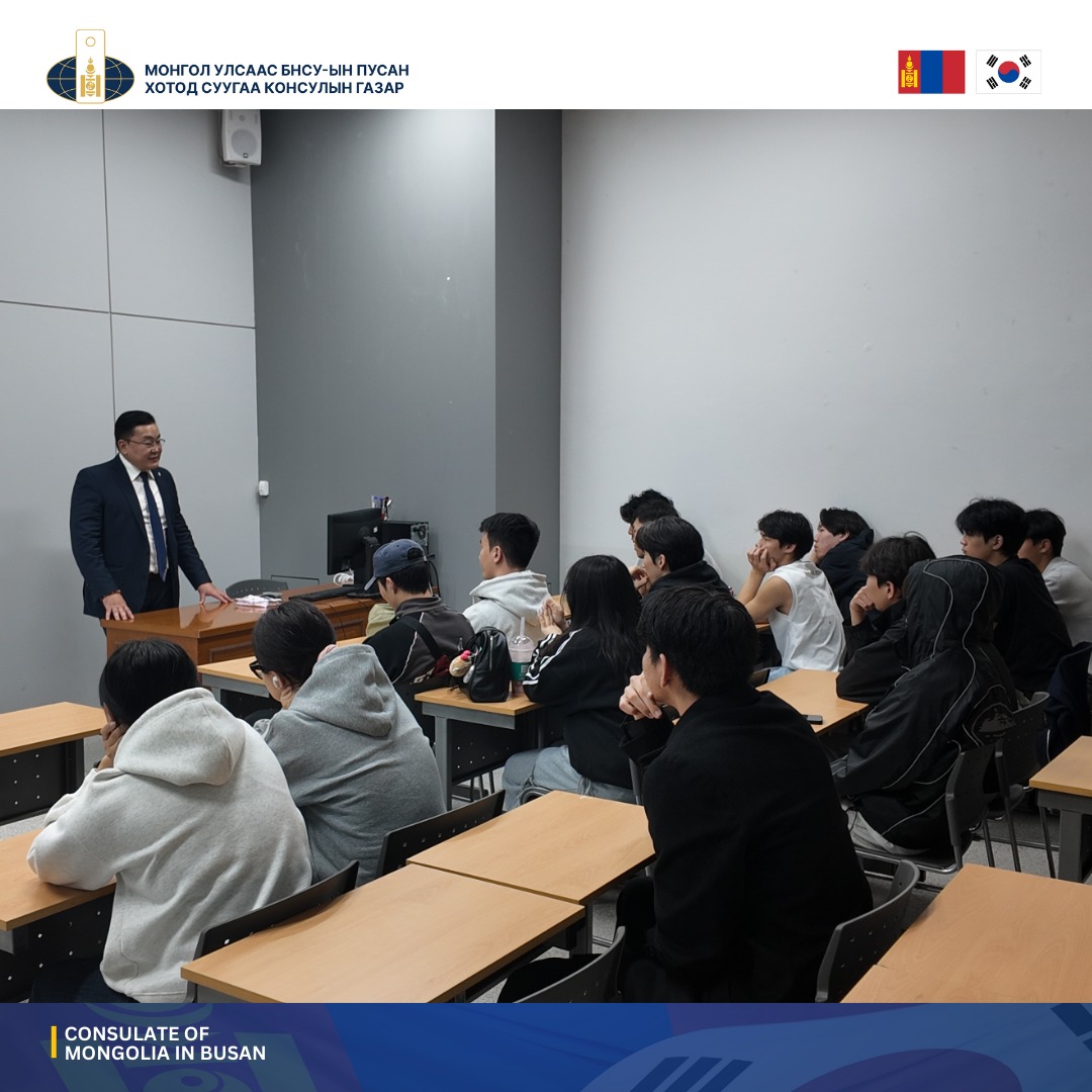Уулзалтын үеэр Консул Ц.Жадамбаа оюутнуудад гэмт хэргээс урьдчилан сэргийлэх, өдөр тутмын аюулгүй байдлыг хангах, БНСУ-д мөрдөгдөж буй хууль, журмыг чанд баримтлахын чухлыг онцлон зөвлөгөө, мэдээлэл өгсөн юм.