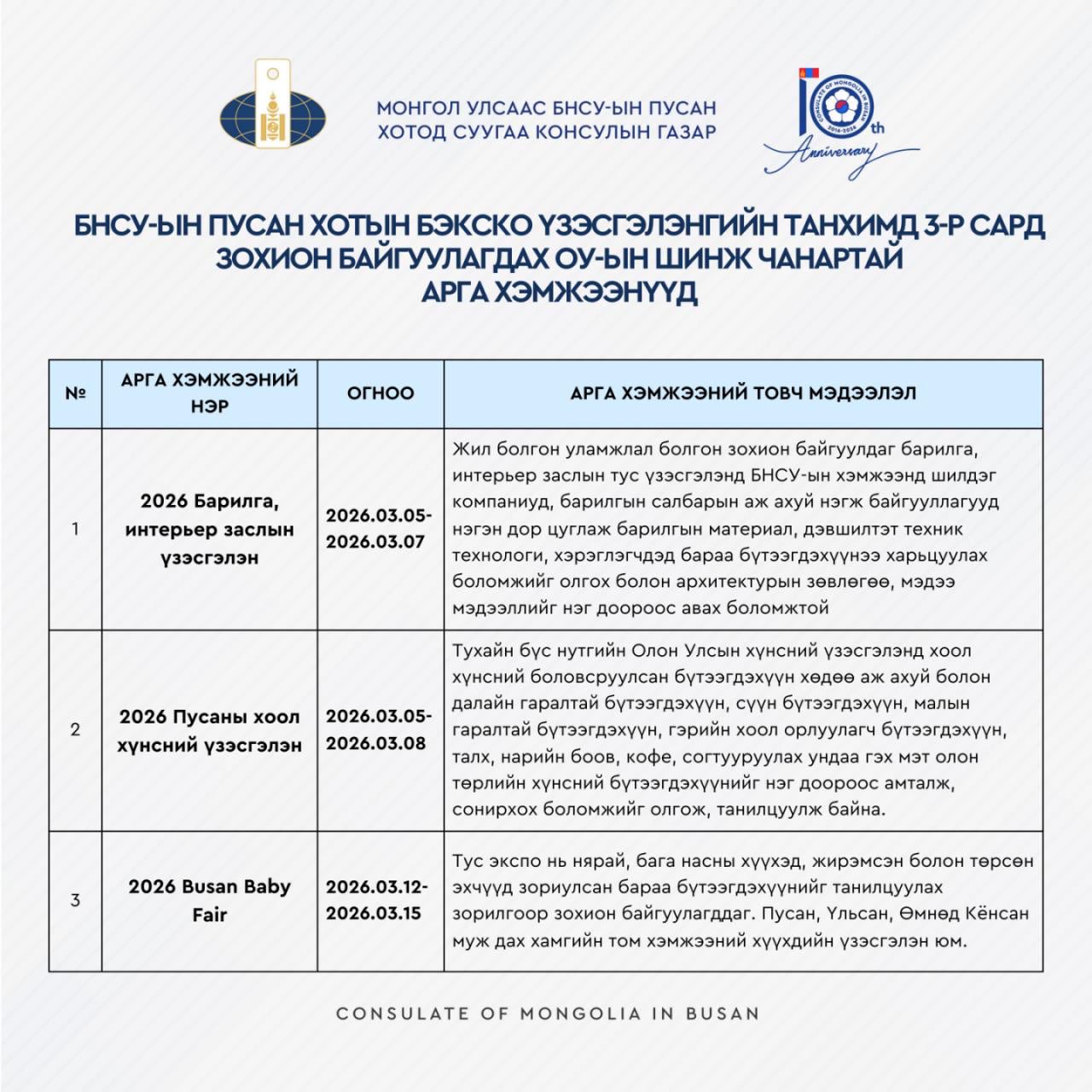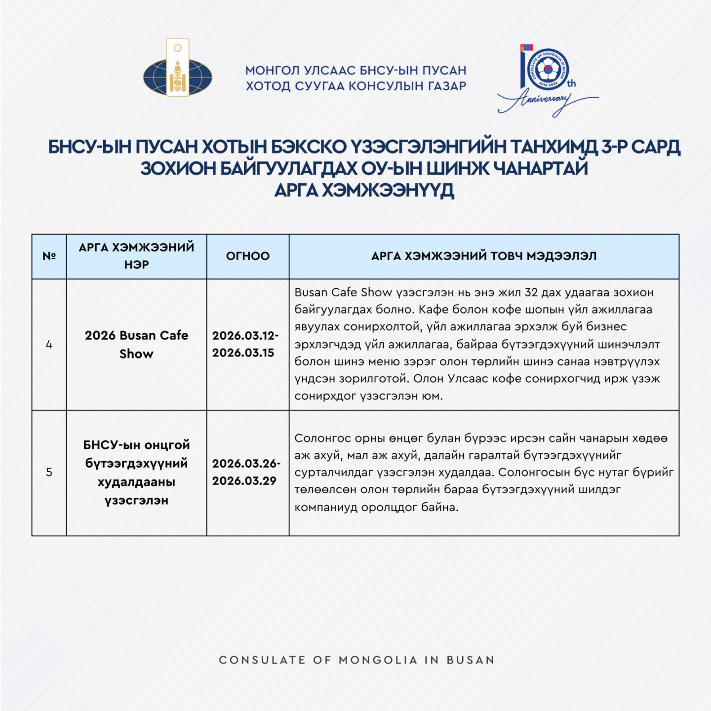 Хоёр орны худалдаа, эдийн засгийн хамтын ажиллагааг хариуцсан Консулын тойрогтоо хөгжүүлэхэд дэмжлэг үзүүлэх үүргийн хүрээнд Монгол улсаас БНСУ-ын Пусан хотод суугаа Консулын газраас Пусан хотын Олон улсын BEXCO Үзэсгэлэнгийн танхимд 3-р сард зохион байгуулагдах ОУ-ын шинж чанартай арга хэмжээг танилцуулж байна.