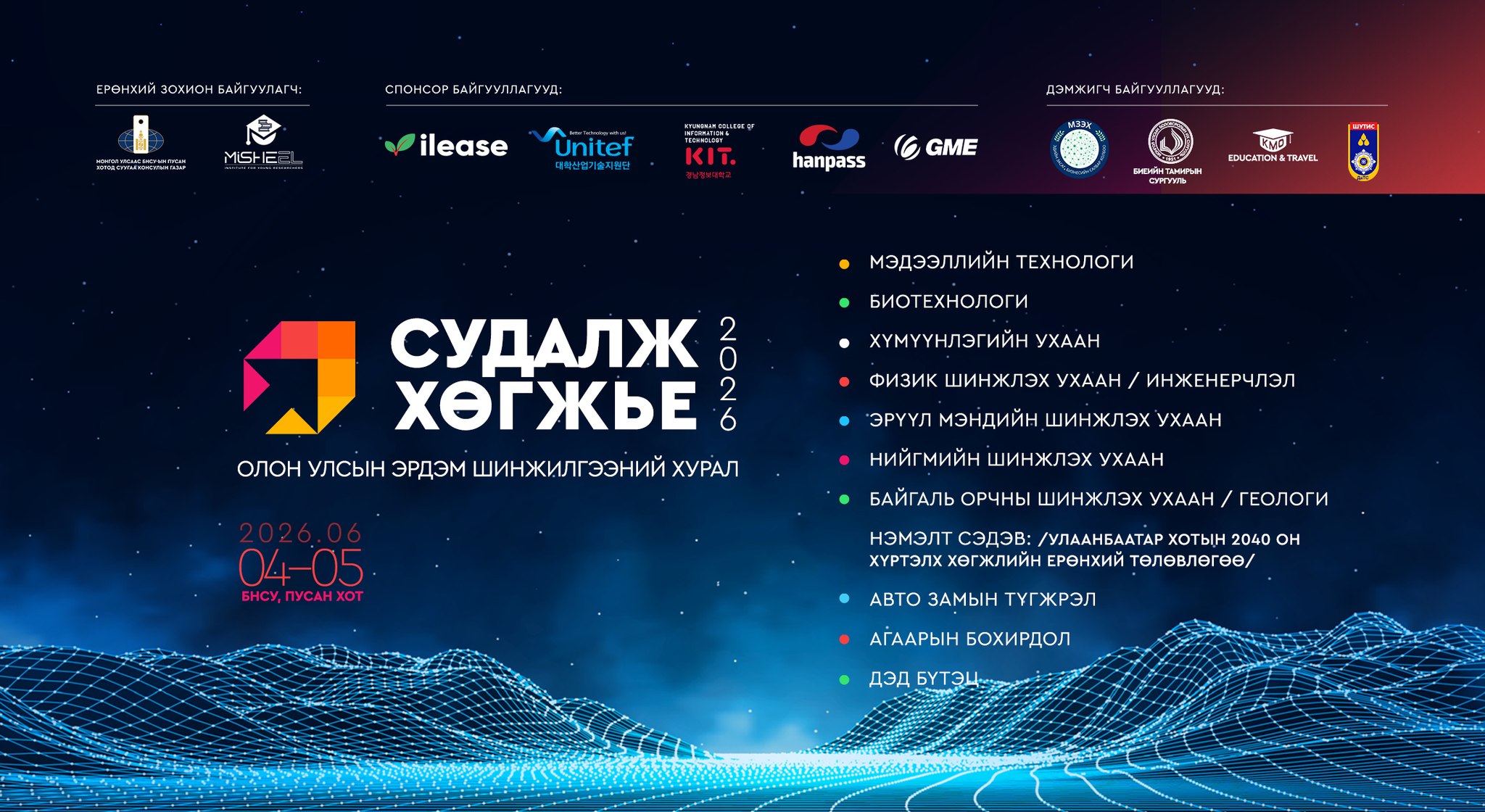 Эрхэм хүндэт Эрдэмтэн, багш нар, судлаач оюутнууд та бүхнийг “Судалж хөгжье-2026” ЭШХ-д бүтээлээ ирүүлэхийг урьж байна.
